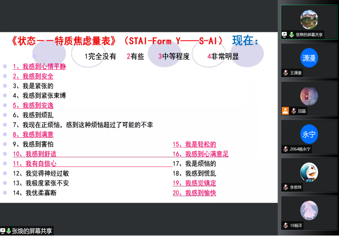 张焕对大家进行了心理辅导,对同学们因疫情影响生活、影响实习导致的焦虑以及面对毕业工作产生的焦虑进行测量与疏导,确定大家的心理状态良好,并引导大家正确面对目前状况,调整好自己的状态,继续向前。