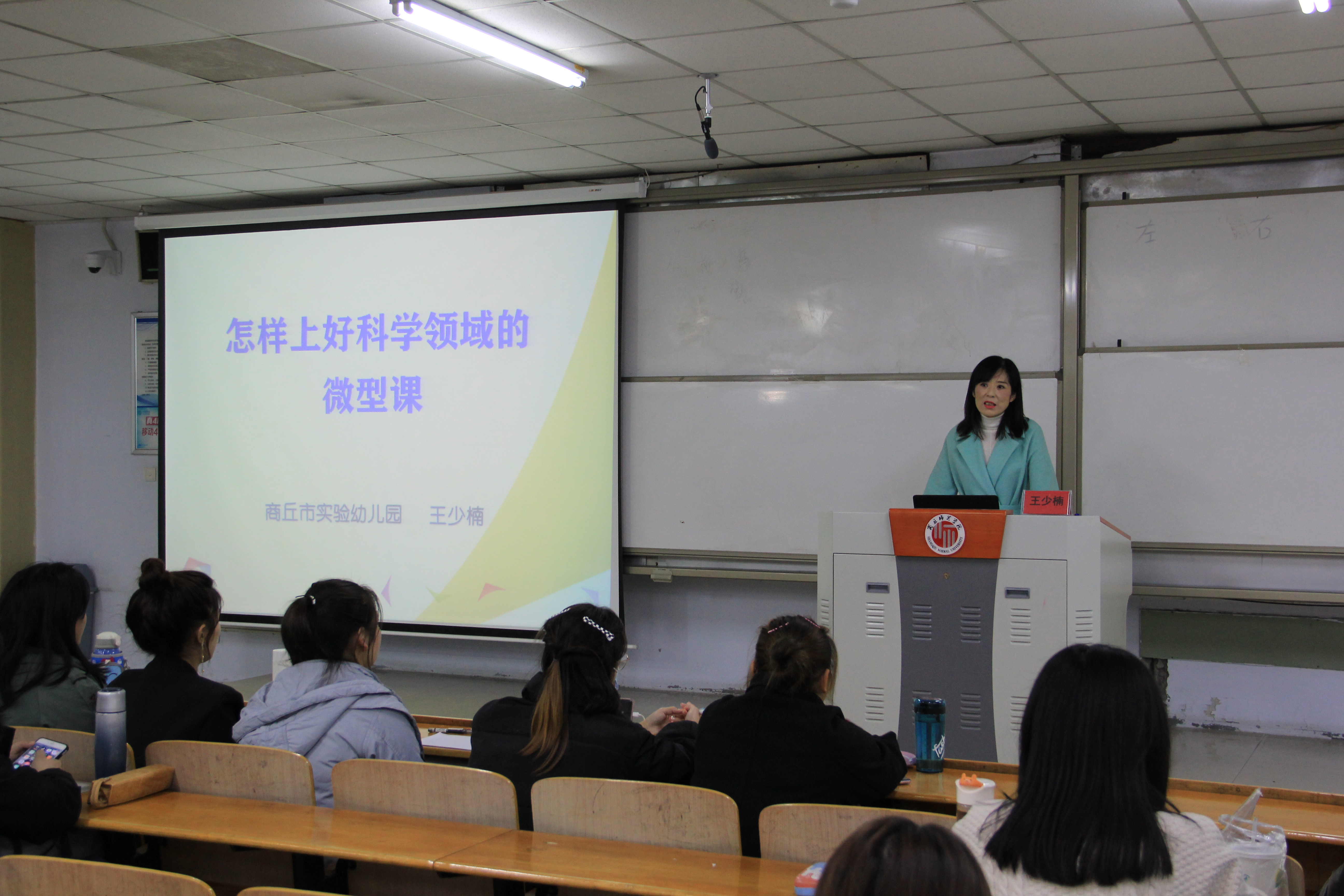 2021年11月7日下午学院于智圆楼220教室举办了“互联网+”学前教育科学领域微型课专题讲座,主讲人为商丘市实验幼儿园副园长王少楠老师,本次讲座由2019级李钰同学主持,参加人员有工作坊班主任李敏、部分学前教育专业教师以及2019级学前教育专业全体学生。