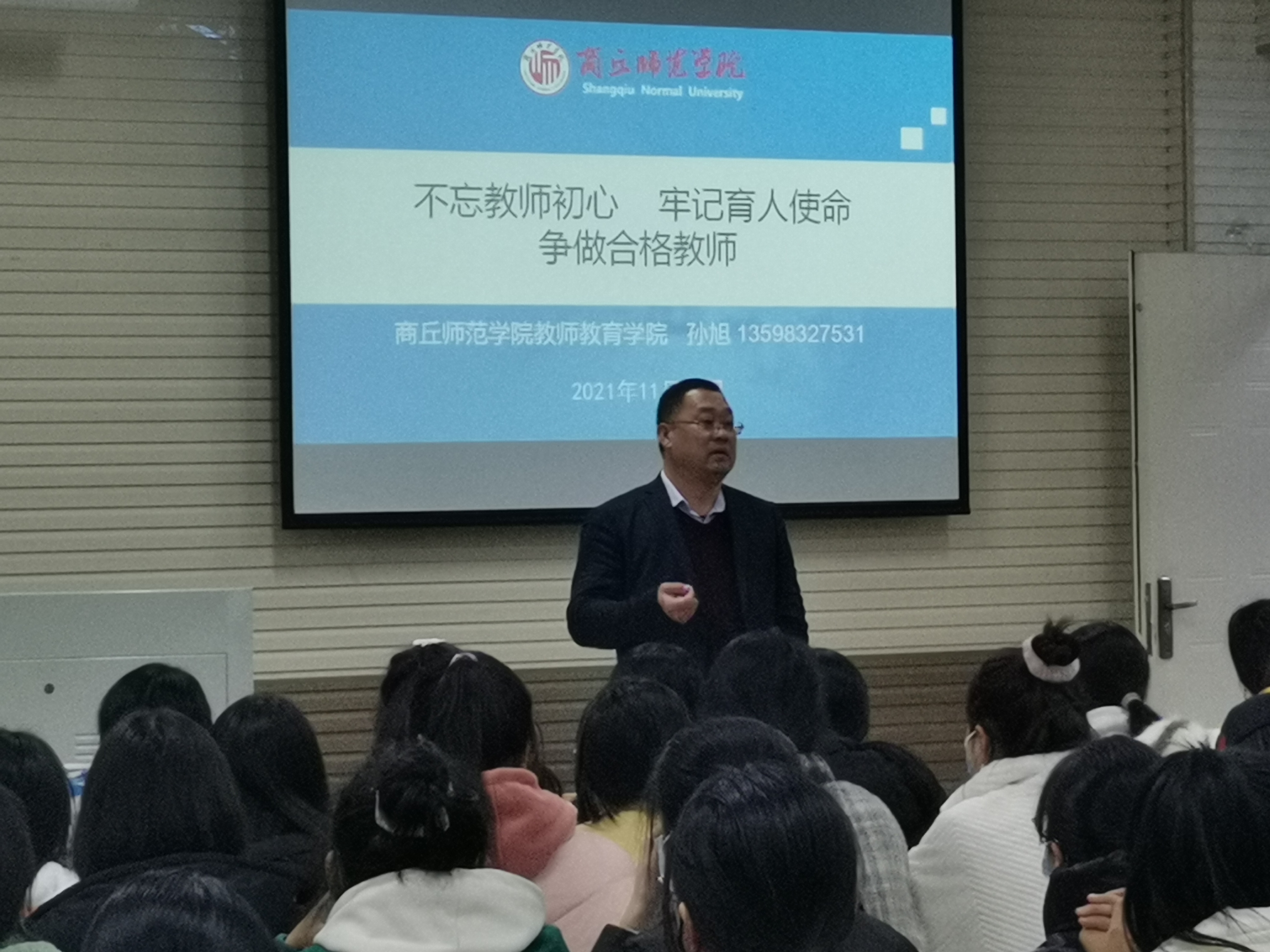 11月22日,学院院长孙旭在汉梁楼为2021级学前教育专业学生上了堂“不忘教师初心 牢记育人使命 争做合格教师”的主题班会。
