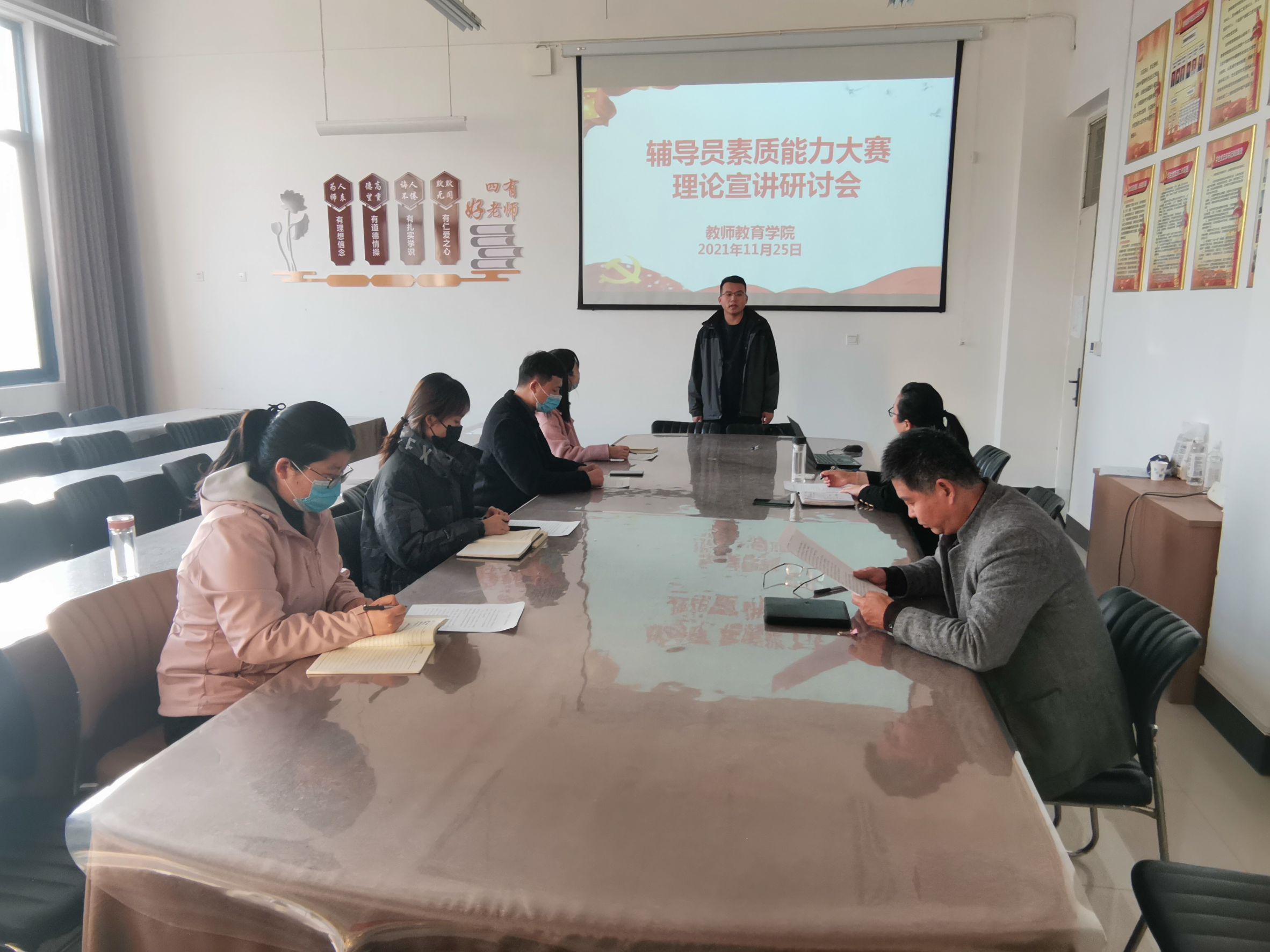 11月25日,学院辅导员素质能力大赛之理论宣讲研讨会在汉梁楼203会议室举行。我院党委书记蒯秀丽、党委副书记邱友谊和全体辅导员参加了此次研讨会。