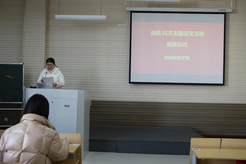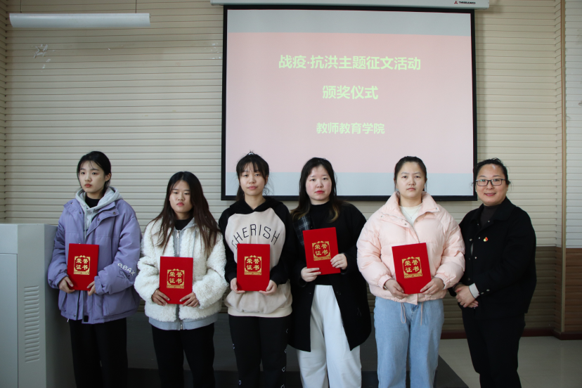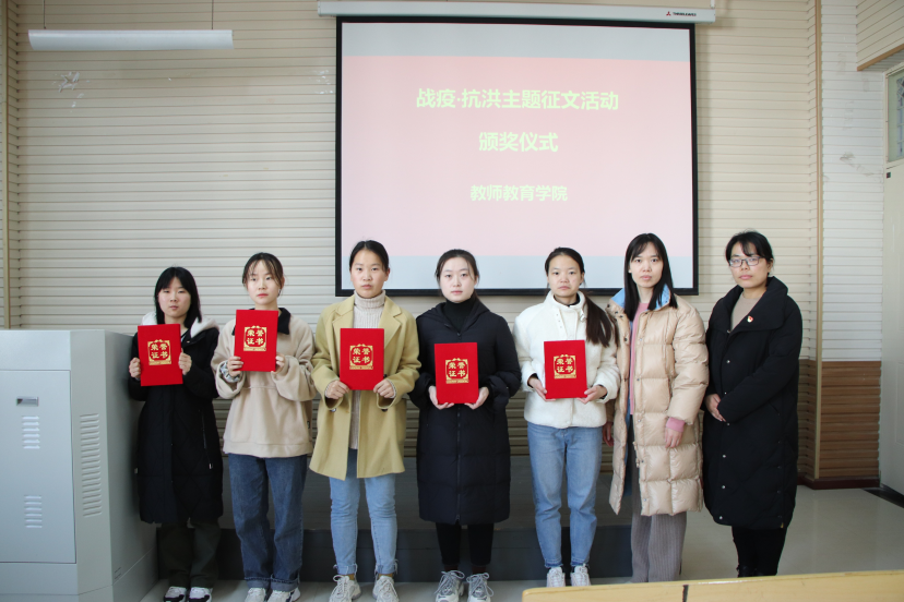 11月10日,学院在汉梁楼310举行 “把灾难当教材;与祖国共成长”主题教育活动之战疫;抗洪主题征文颁奖仪式。学院党委书记蒯秀丽、团委书记董若颖、学生工作办公室主任李秀勤以及辅导员赵静,田晨曦参加。董若颖和李秀勤为获得一等奖的学生颁发了荣誉证书和奖品。蒯秀丽为获得特等奖的学生颁发了荣誉证书和奖品。